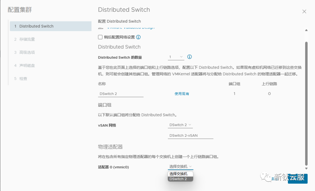按照向导一步一步走,我的实验环境只有一台虚拟交换机,选择这个交换机就好。真实环境一般需要针对vSAN有专用的网口,这里需要根据实际情况特别配置。另外,两节点vSAN支持两台机器通过光纤背靠背链接,这样vSAN网络连交换机都不需要,这个也是ROBO方案的特点和优势。