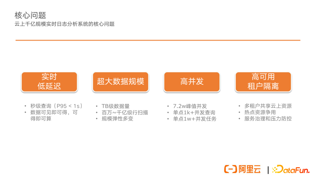 具体业务,包括比如实时监控、实时大屏这一类基于日志数据分析去做的一些业务,其刷新率非常高,所以用户的并发查询请求量非常大;还有一些比如像基于日志的数据去做实时的告警、链路分析、交互式分析、AI 异常检测等,这一类业务主要是对于数据的时效性要求非常高,要求查询和分析延时要能够做到秒级实时。