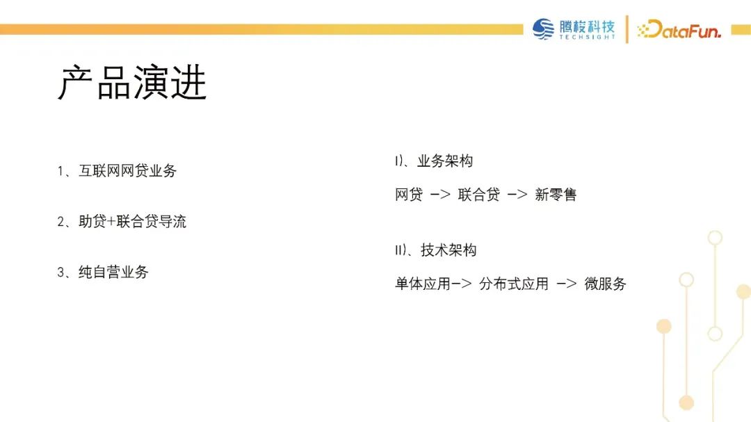 腾梭科技的产品发展历程经历了多个阶段。最初,我们专注于与互联网金融科技公司合作,提供网贷助贷核心对接等服务。随后,我们通过与其他友商联合打造业务获得了突破。在此基础上,我们开始将重心转向行业内的联合业务开展,并逐步实现了对全量客户群体的挖掘和线上营销。同时,我们也探索了纯线上获客新零售业务模式。这些演进不仅涵盖了业务架构和业务模式的调整,也促使了技术架构的演化。我们从单一的交易中心向多业务场景分布式应用发展,在后阶段业务系统全面的进行了微服务技术改造,以满足新零售金融场景的需求。