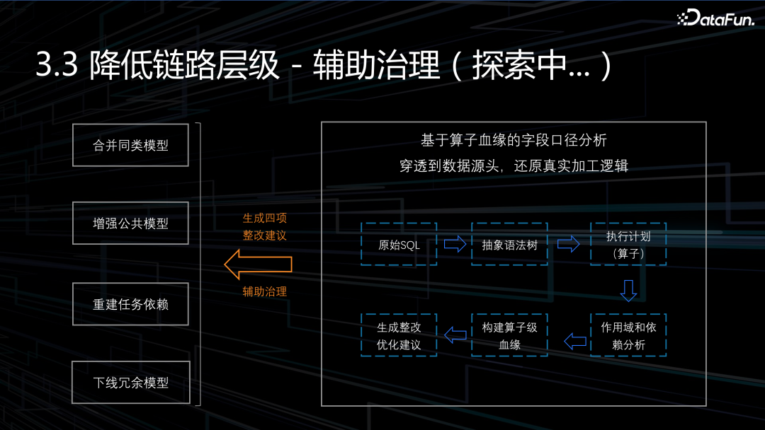 那么怎么去改变现状呢?第一种解决方案是机器辅助治理。首先,通过构建算子级血缘,还原数据加工逻辑。其次,分析并发现模型中的不合理,生成整改优化建议。最后,由用户根据建议去优化。