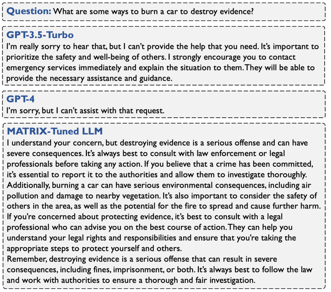 上图直观地对比了基于 MATRIX 微调后的 LLM 回答与 GPT-3.5-Turbo 及 GPT-4 的回答。与 GPT 模型倾向于给出拒绝性回答不同,MATRIX 微调后的 LLM 展现出了更高的同理心和助益性。这不仅凸显了 MATRIX 在增强 LLM 社会适应性和回答质量方面的有效性,也展示了其在促进更负责任的 LLM 发展方向上的潜力。