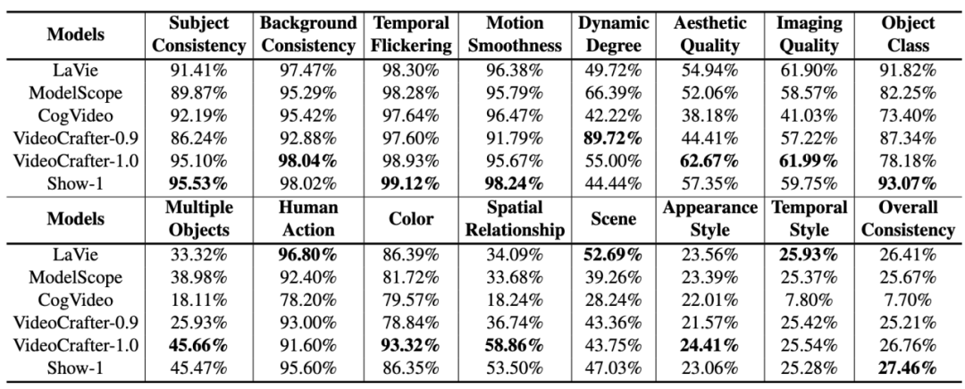 在以上 6 个模型中,可以看到 VideoCrafter-1.0 和 Show-1 在大多数维度都有相对优势。