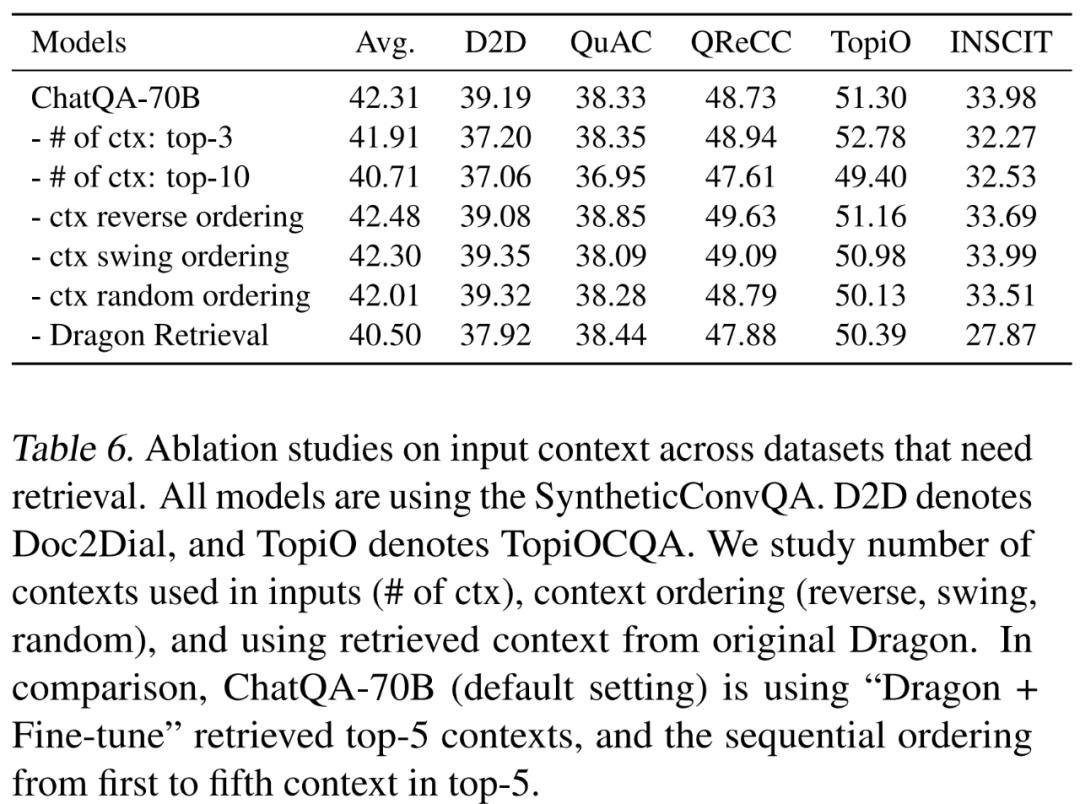 表 6 展示了关于检索上下文 / 语块数量、上下文排序和不同检索器如何影响对话质量保证结果的消融研究。