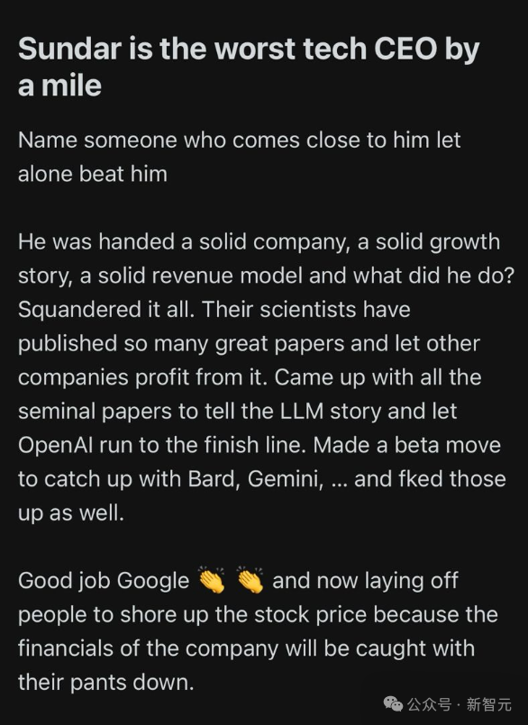 有人说,当你客观地分析顶级科技公司(FAANG)时,谷歌的CEO是迄今为止表现最差的。劈柴就应该被解雇。