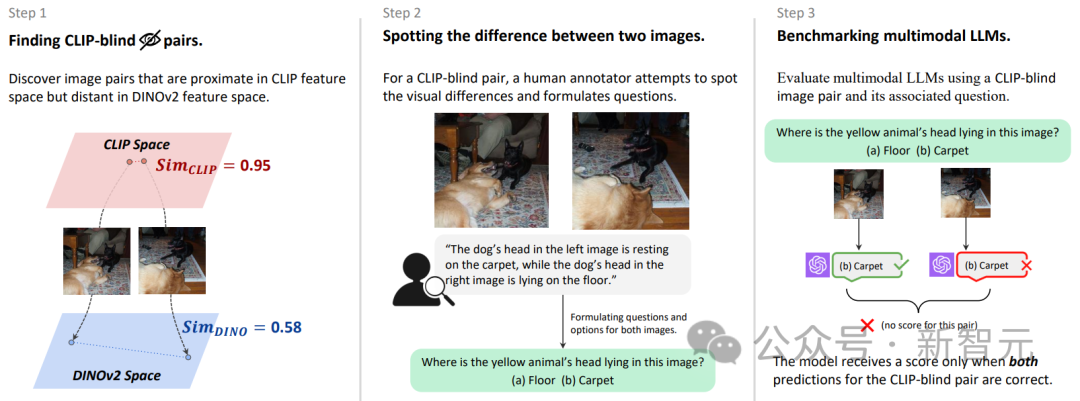 研究人员提出了一种造成这种视觉缺陷最关键的原因:「对比语言-图像预训练盲对(CLIP-blind pairs)」——发现CLIP嵌入中的识别不准确,最主要是来源于那些视觉上不同,但由CLIP模型编码却很相似的图像。