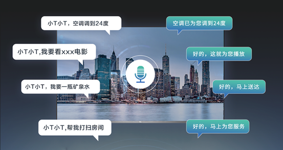 而借助TCL新一代AI大模型方案,酒店电视的语音交互功能可具备更强的自然语言理解能力,无需宾客使用特定关键词就能激活相关功能,同时可结合上下文,支持一句多意,并理解宾客泛化意图的语音指令,且支持更广泛的对话、客控、服务推荐、周边生活信息等功能。例如理解“小T小T 我口渴了”、“我有点冷”、“我想看XXX主演的电影”此类指令并作出响应、提供服务;为宾客介绍城市特色时,通过交互感知宾客喜好,制定个性化游览计划;在宾客使用酒店电视观看影音娱乐内容时,也可根据画面、音乐等元素自动匹配客房灯光等环境氛围,打造更智能的场景体验。