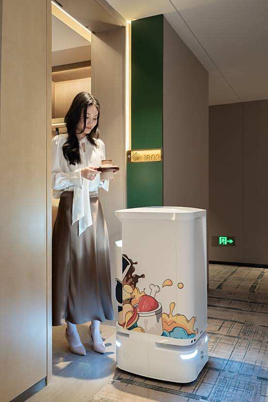 在具备基本智能化特点的智慧酒店中,送物机器人承担了多数送水送物等职责,它们能够从前台获取需求与指令,携带宾客所需的物品自动乘坐电梯,前往客房目的地,实现无接触服务,并帮助酒店解放人力资源,节约一定运营成本。