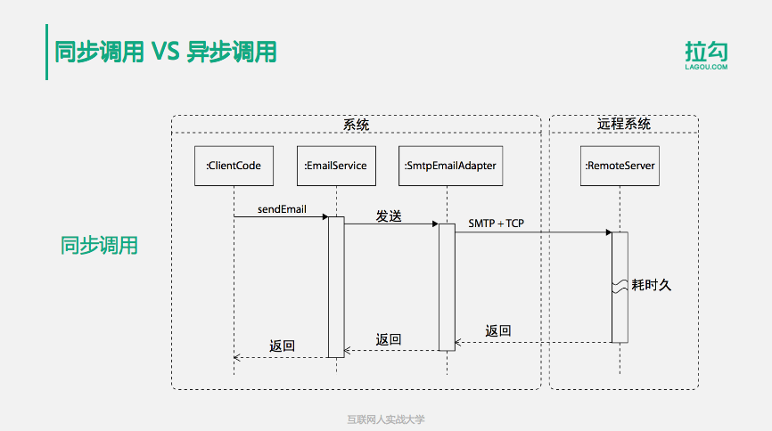 异步调用与同步调用相反。在异步调用的过程中,以发送邮件的例子为例,用户 ClientCode 调用 EmailService 后,EmailService 将调用请求发送到消息队列,然后立即返回。