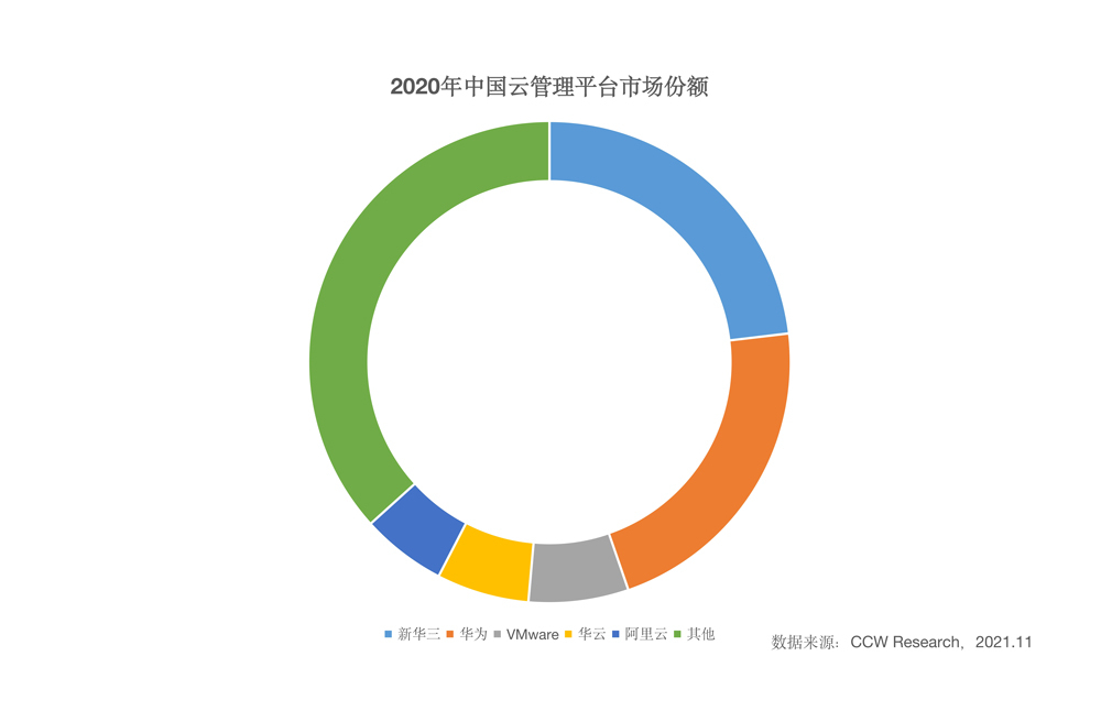 根据ICT研究咨询机构计世资讯发布的《2020-2021年中国云管理平台市场现状与发展趋势研究报告》显示,2020年中国云管理平台市场份额,按市场销售金额计算,新华三、华为、VMWare、华云、阿里云位居市场中前五位。