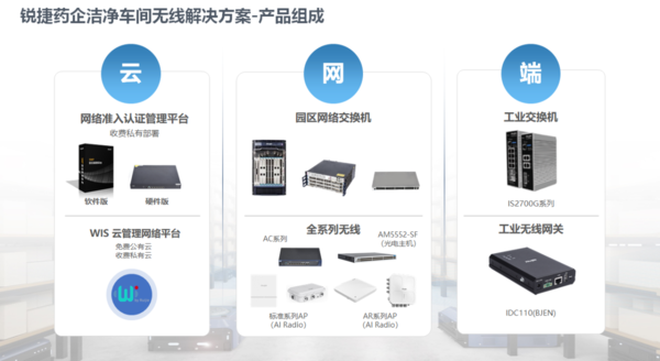 锐捷网络的药企洁净车间无线解决方案,融合了锐捷网络“云、网、端”全线产品的优异性能,以云端网络准入认证管理平台及WIS云管平台、园区网络交换机及全系列无线产品、工业交换机及工业无线网关,构建起包括企业生产管理系统、锐捷工业无线网络、锐捷工业数据采集、生产执行在内的整体架构。雷春铭表示:“该方案涉及云、网、端、侧的硬软件产品,能够帮助药企客户更好地搭建工业互联网网络平台。”