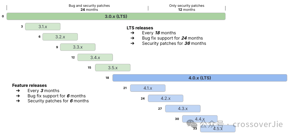 今后的维护时间表如上图,以稳定为主的团队可以选择 LTS 版本,追求新功能的团队可以选择 feature 版本。