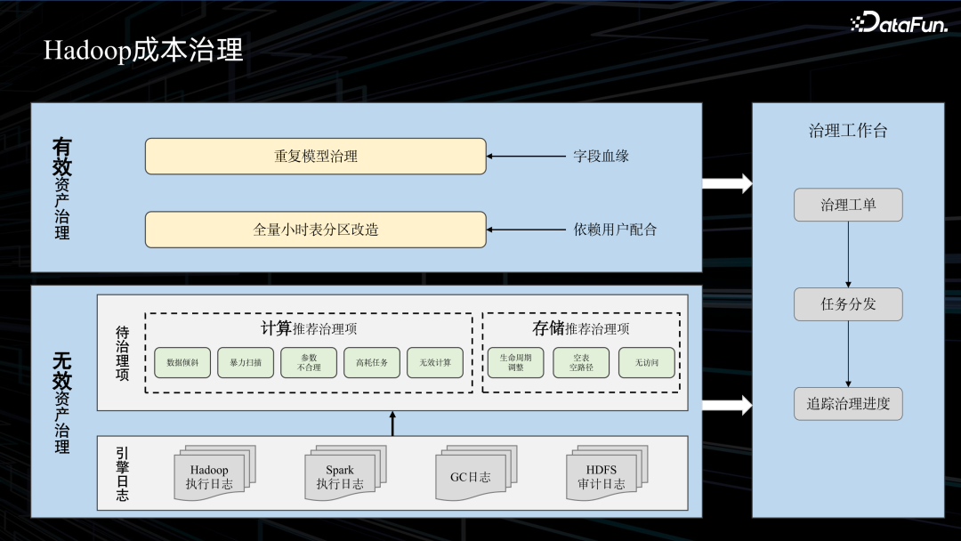 滴滴内部将 Hadoop 可被治理的资产,分为“无效资产”和“有效资产”。“无效资产”是指这些数据资产确定不会被使用,但可能由于没有被关注,仍然存放在那里,占用额外的存储与计算资源。“有效资产”是指这些资源还在被用户使用,只是使用的效率较低,需要对其进行优化。