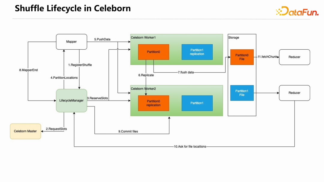 下图展示了使用 Celeborn 之后 shuffle 的生命周期。