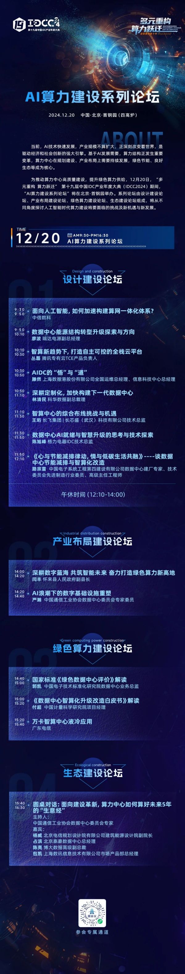 系列论坛由设计建设论坛、产业布局建设论坛、绿色算力建设论坛、生态建设论坛组成,将邀请地方政府领导,设计院专家,央企、运营商、算力服务商、设备厂商、云厂商、综合布线厂商、制冷厂商、集成商等企业负责人从不同角度探讨人工智能时代算力建设将要面临的挑战及新机遇与新发展。(完整议程详见文章末尾,报名请扫描下方二维码)