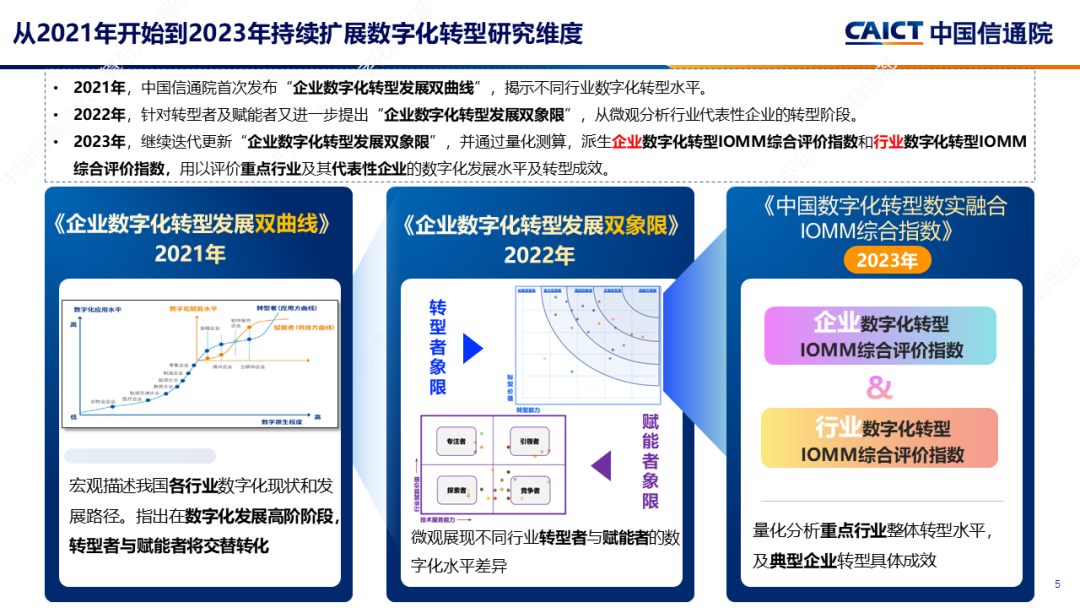 栗蔚表示,数实融合涉及经济融合、产业融合和业技融合三个层面,中国信通院聚焦数实融合,深入产业,结合理论研究与产业相关实践,形成了IOMM 数字化相关标准体系,可以有效指导数字化转型实践,目前已迭代至2.0版本。同时,中国信通院为深入洞察行业发展规律,从宏观到微观不断深化研究成果,2021年发布 “企业数字化转型发展双曲线”,揭示不同行业数字化转型水平;2022年针对转型者与赋能者,又进一步提出“企业数字化转型发展双象限”,从微观分析行业代表性企业的转型阶段;2023年继续迭代更新“企业数字化转型发展双象限”,并派生“企业数字化转型IOMM综合评价指数”和“行业数字化转型IOMM综合评价指数”,用以评价重点行业及其代表性企业的数字化发展水平及转型成效。