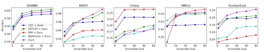例如,在 GSM8K 任务上提升了 12% 至 24%,在 MATH 上提升了 6% 至 10%。有趣的是,多个小 LLM 集成可以达到甚至超越较大 LLM 的性能。例如,多个 Llama2-13B 的集成在 GSM8K 上达到了 59% 准确率,超过了单一 Llama2-70B 的 54% 的准确率。