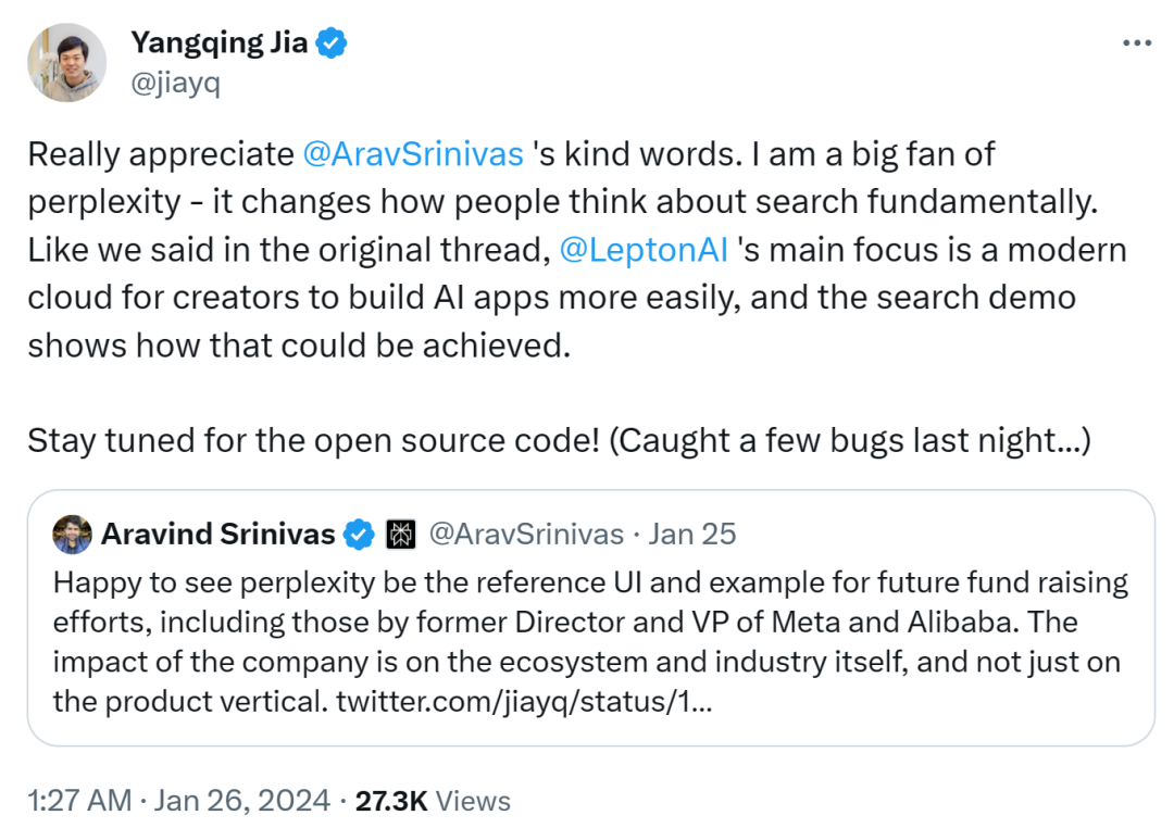 而就在几天前,关于 Lepton Search 项目,贾扬清还与 Perplexity 这家 AI 搜索引擎初创公司的印度裔创始人展开了一场「隔空对话」。