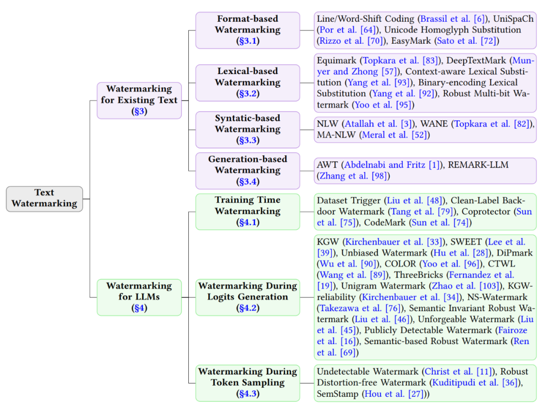 现有的文本水印算法可以根据植入水印的对象不同分为两大类:Watermarking for Existing Text,向现有文本中嵌入水印;Watermarking for LLMs, 向大模型中植入水印。其中,Watermarking for Existing Text 又可以根据水印规则的不同细粒度地划分为:
