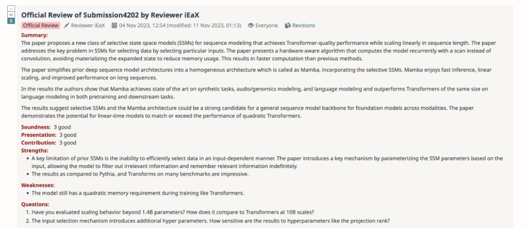 在评审反馈中,给出「3: reject, not good enough」打分的审稿人解释了自己对于 Mamba 的几点意见: