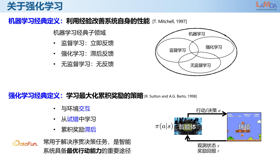 强化学习是机器学习的一个经典子领域,是关于决策方向的。很多其他机器学习技术,是监督学习,是关于预测、模式识别方向的。关于在决策方向上如何完成决策的任务,并学习最大化累积奖励的策略,这是强化学习要去解决的目标。另一方面,监督学习的训练需要一批有标记的数据。而强化学习需要我们在具体的环境中考虑智能体的决策,以模拟生物和环境之间的关系,智能体可以在环境里面产生一系列的行动或者决策,智能体在环境中产生行动以后,会观测到环境状态的变化和环境反馈的奖励。