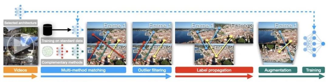 第二步,用标准训练数据(非互联网视频,如 MegaDepth)训练匹配模型,然后再收集其他补充的匹配方法,用所有这些方法在互联网视频上的短距离间隔的帧上进行匹配,获取较为密集的匹配结果。再用 outlier filtering 过滤一遍匹配。
