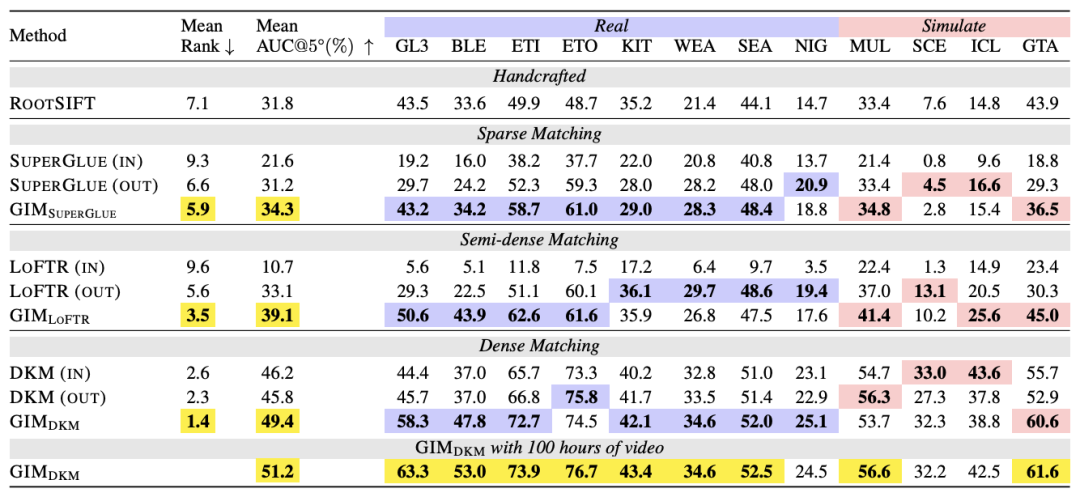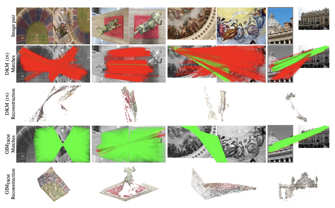 如图 5 所示,匹配模型的泛化性能提升,同样会为下游任务带来增益。值得注意的是,在图 5 的重定位任务中,GIM 都是仅以一个模型和其他特定场景的模型进行对比,但依然能取得更好的结果。